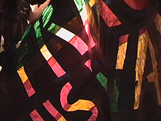 “This piece was first made with the help of two local craftsmen at Khoj International Artist’s Workshop in Modinager, India, two months after the 9/11 attacks. The title refers to both the language of packaging, the actual fragility of the piece, as well as the sense of fragility, uncertainty and exposure I felt living and working in India during this time of extreme tension. Part package, part ritual shelter; based on grottos, nomadic tents and childhood memories of bed-sheet tents, this piece was installed in my bedroom in Modinagar. I used cloth and light to create a stained glass effect which combined with cellophane attempted to disguise the size of a given interior space. The inclusion of cut-outs of the queen reflect an on-going interest in the British monarchy – in this case with particular reference to the Koh-i-noor diamond.” – Hew Locke